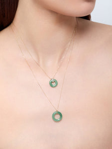 A symbol of balance and prosperity, our 14kt Jade Donut Necklace embodies timeless elegance with a modern touch. The smooth green jade donut, celebrated for its calming energy and natural beauty, is suspended from a delicate 14kt gold chain—creating a refined yet effortless statement piece.