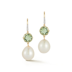 Each earring showcases a brilliant round-cut green amethyst, set in 14kt yellow gold, radiating a fresh, luminous glow. Suspended below is a uniquely shaped baroque pearl, prized for its organic beauty and iridescent sheen. A delicate row of pavé diamonds on the ear wire adds a whisper of sparkle, making these earrings effortlessly refined.