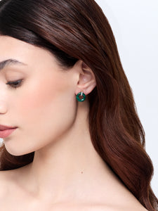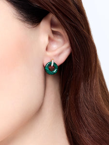 A striking interplay of rich color and refined craftsmanship, our 14kt Malachite Donut and Diamond Door Knocker Earrings are designed to captivate. The deep green malachite, with its distinctive natural striations, is sculpted into a smooth donut shape. A delicate 14kt gold hoop, adorned with pavé diamonds, suspends the malachite, adding brilliance and movement with every turn.