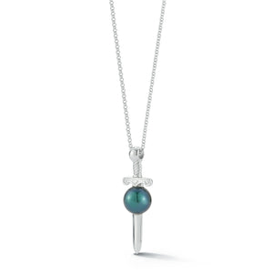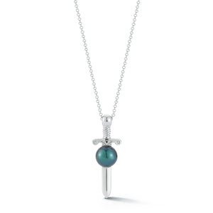 An emblem of bold elegance, this necklace pairs the sleek edge of a sterling silver sword with the dark allure of a black pearl. Designed as a symbol of quiet strength and individuality, the pendant evokes a sense of mystique and modern armor. Suspended from a sterling silver chain, it’s a powerful statement—refined, rebellious, and effortlessly cool.